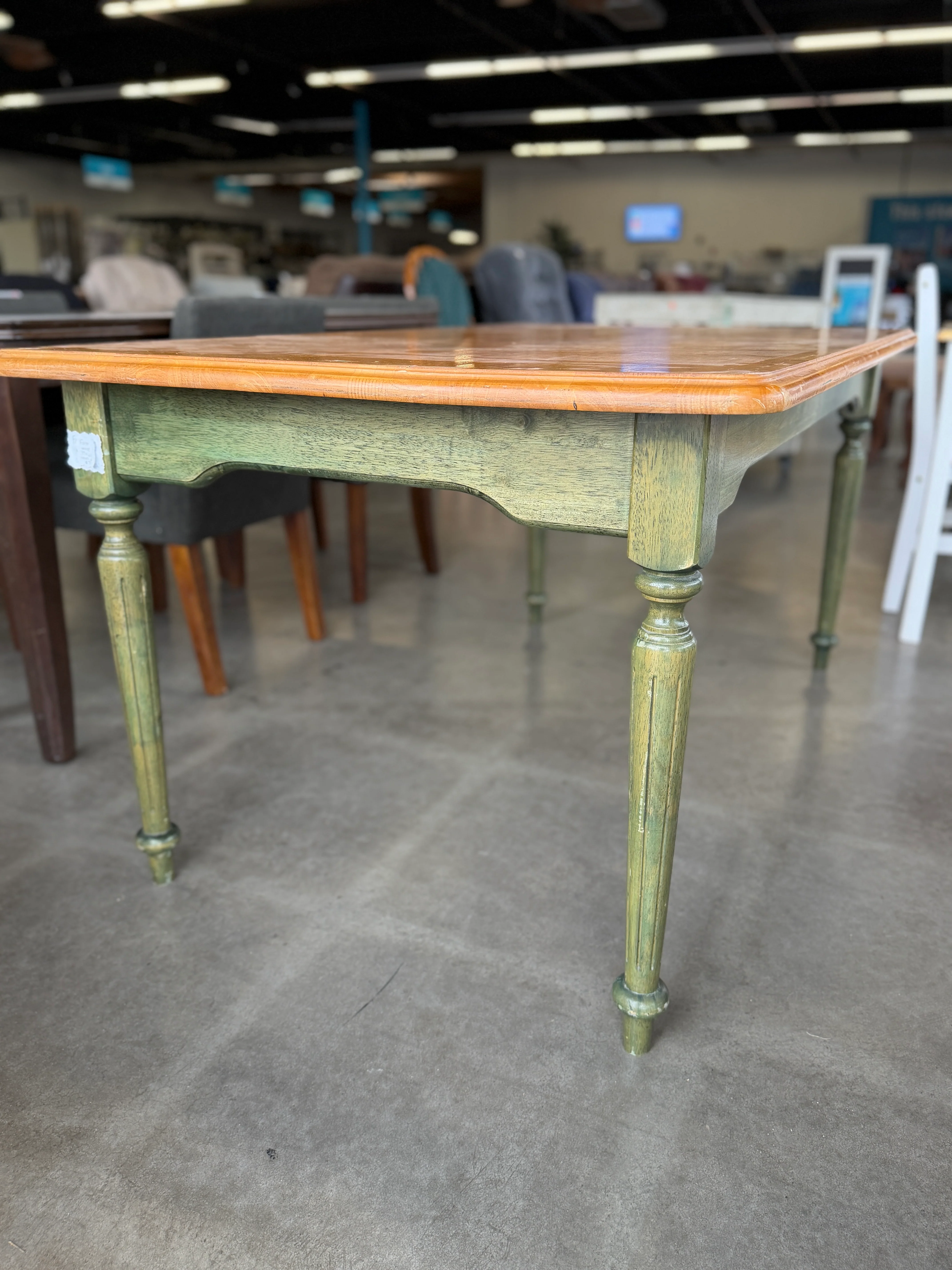 This dining table features a warm wooden tabletop paired with uniquely finished green legs, offering a rustic charm and vintage appeal. Approximate Size: 2.5 x 5 x 3